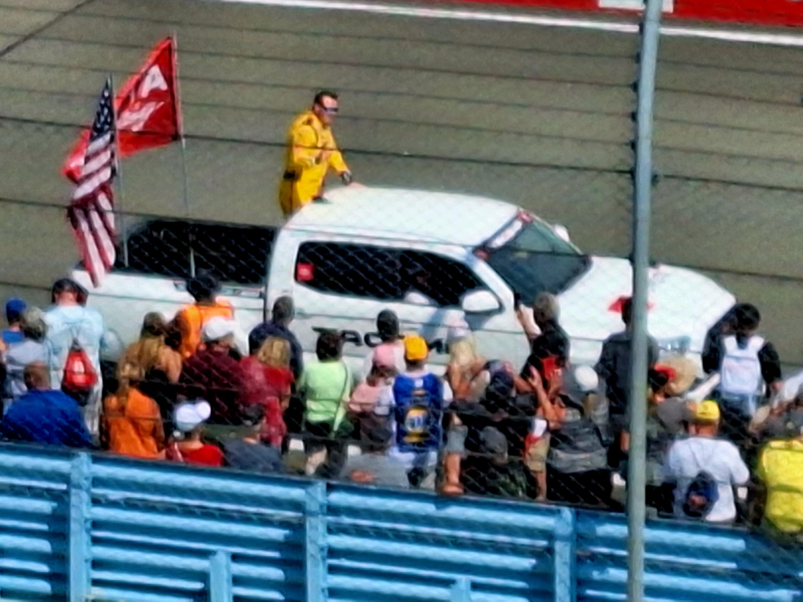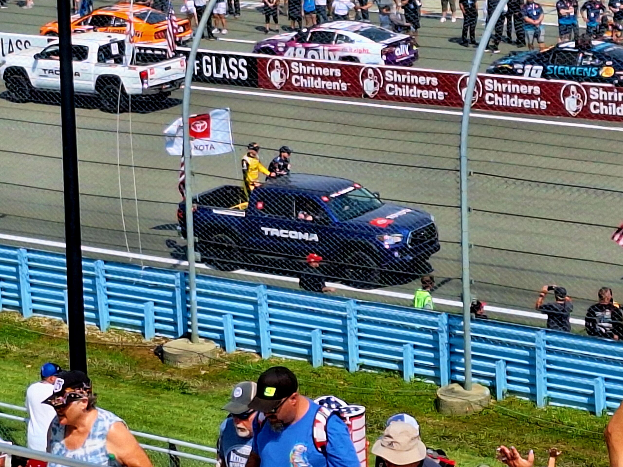 Just after 3pm, opening festivities begin with driver introductions, the Canadian and American anthems, pyrotechnics, as well as the flyover. One little funny side story is the somewhat badly timed pyro mixed with a very low flyover….you can use your imagination to see how that could be a problem with a low flying plane and fireworks (at least it appeared that way).