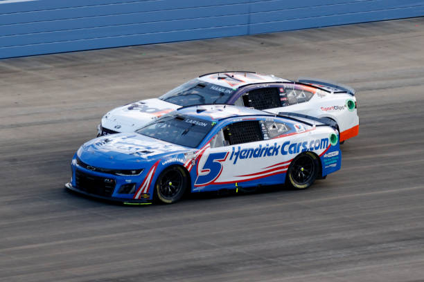 Kyle Larson is the only driver to finish all 3 Next Gen Nashville races in the Top 10, while the driver to his outside, Denny Hamlin, is the only driver racing this weekend to get a Stage T10 in all 6 Next Gen stages here. Photo by Jeff Robinson — Icon Sportswire via Getty Images