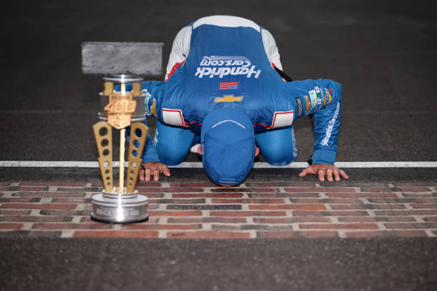 Kyle Larson got to kiss the bricks at Indy last year, and based on the stats with his speed this weekend he is projected to do so again this year. Photo by James Gilbert — Getty Images