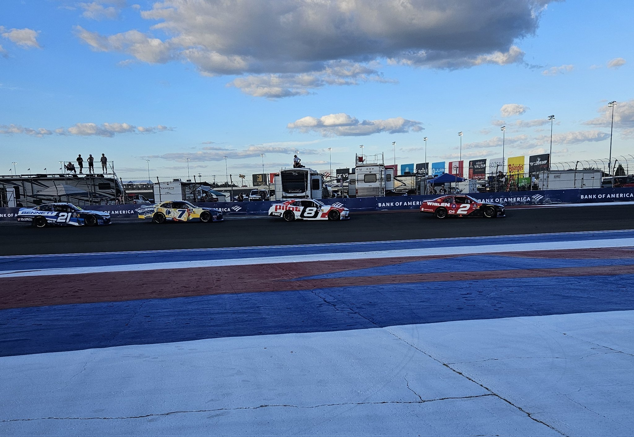 With 11 to go in the race, Nick Sanchez had to pit with a flat tire. Sammy Smith had to pit on the next lap. As soon as Smith stopped in his box, the caution came out. Sage Karam lost his right front tire. He dropped debris on the back stretch.