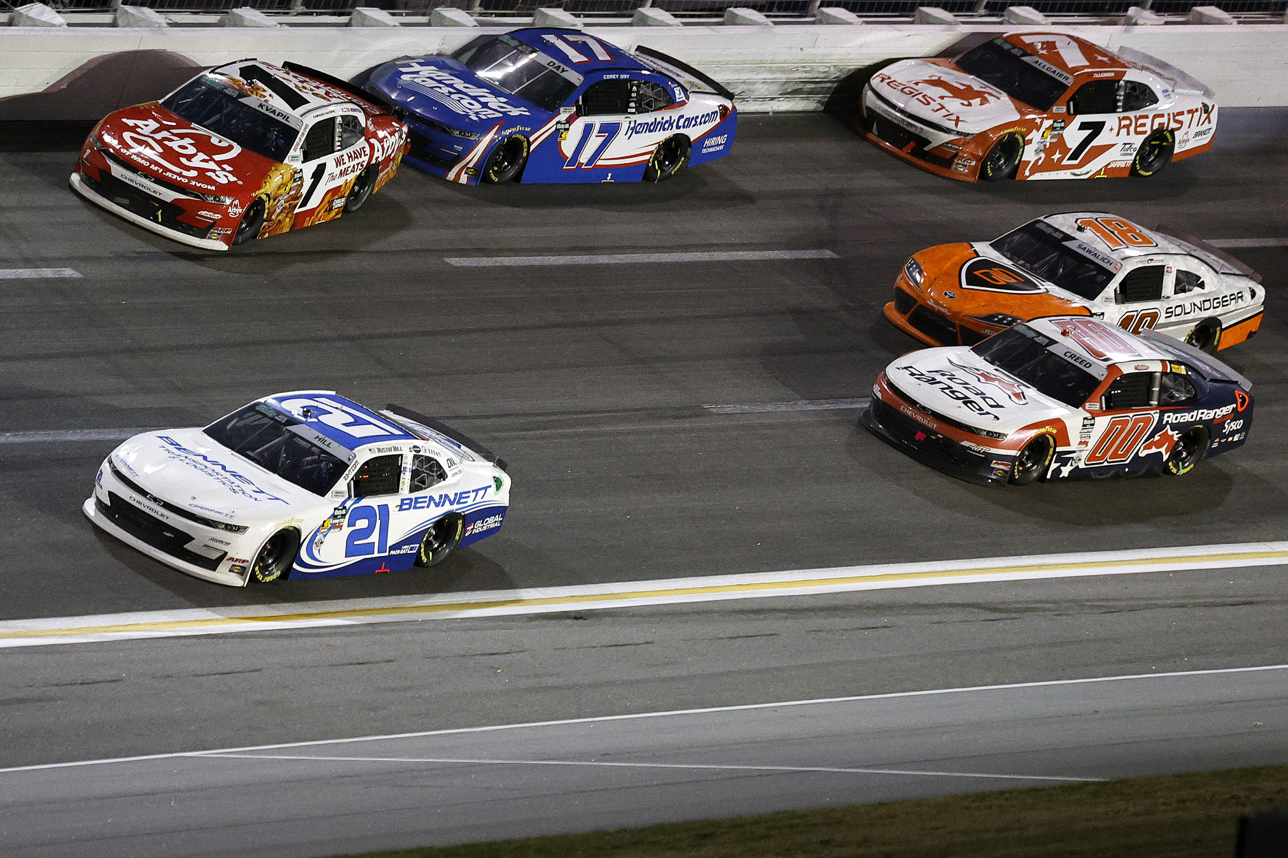 Corey Day takes out two of his JR Motorsports teammates, trying to take the lead. (Photo Credit: Sean Gardner | Getty Images)