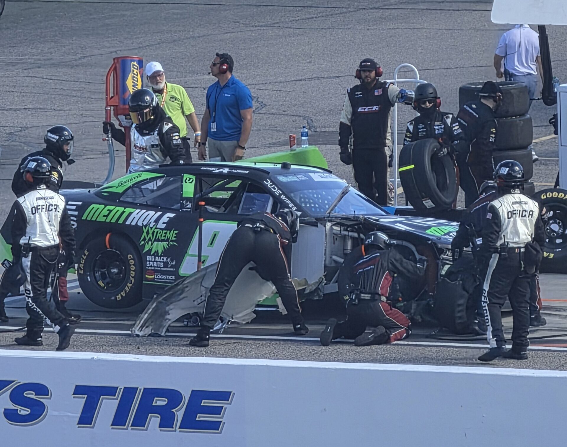 Austin Green got into turn three with too much speed, and then cut a tire after hitting the wall. He was able to get onto pit road safely, so no caution was thrown.